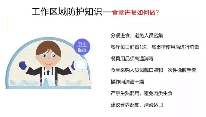 職工食堂建議安排錯(cuò)峰用餐,分批用餐,食堂提供一次性餐盒,餐具使用外由專人負(fù)責(zé)管理消殺后再堆放到垃圾清理處,食堂菜單應(yīng)加強(qiáng)員工營(yíng)養(yǎng)的補(bǔ)充,葷素搭配,肉蛋和菜品一定更要煮熟,不提供生冷菜品和開胃菜,為避免引發(fā)上呼吸道發(fā)炎,近期食物不宜辛辣香脆,盡可能營(yíng)養(yǎng)清淡。